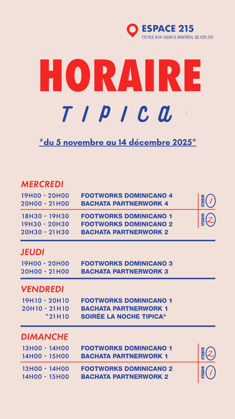 « Je recommande à 100% Tipica pour les personnes qui souhaitent apprendre la bachata dominicaine. Les instructeurs et chorégraphes Julie, Steven, Luis et Eliana sont professionnels, bienveillants, ponctuels et toujours de bonne humeur. Une bonne humeur transmise aux élèves avec beaucoup d'énergie, de passion et de respect! Foncez!»